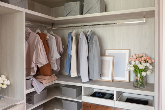 望月さんWICには、I型、Ⅱ型、L型、コの字型などの種類がありますので、その形に合わせて整理収納を考える必要があります。たとえば我が家はL字型のWICですが、ちょうど角にあたる場所がデッドスペースになりがちです。そのため、角部分のハンガーには使用頻度の低い衣類、下にはワインボックスなどの頻繁に出し入れしないモノを収納しています。