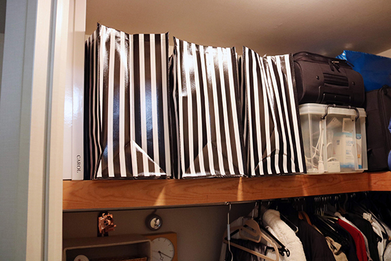 望月さんWICに限らず、すぐに収納用品を購入してしまう方が多いようですが、まず収納用品がそこに本当に必要かどうか、見きわめてから購入するといいですね。写真のような100円の手提げ袋やブランドのショッピング袋、バンカーズボックスのような書類箱で簡単に収納してみて、使いにくくなければ、長く使える収納用品を購入することをおすすめします。我が家では結婚した時に買った収納ケース(Fits)を25年経っても壊れずに使っています。