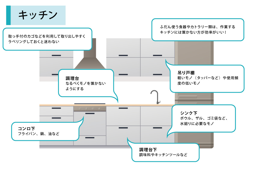基本は、火(コンロ)の下にはフライパンや鍋、水(シンク)の下には水廻りで使うボウルや水きり網、そして軽いモノは上・重いモノは下というルールで考えてください。