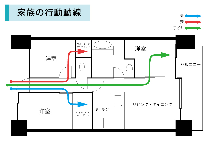 行動動線は、家族であまり重なり過ぎない方が使いやすい動線です。