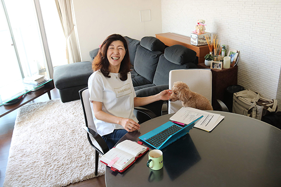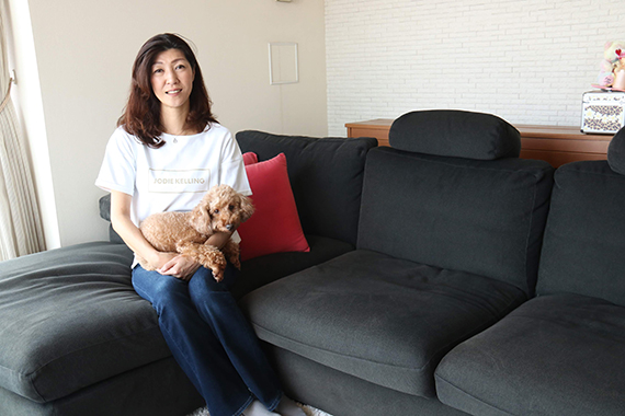リビングで、ペットのそらちゃんと笹田恵子さん。