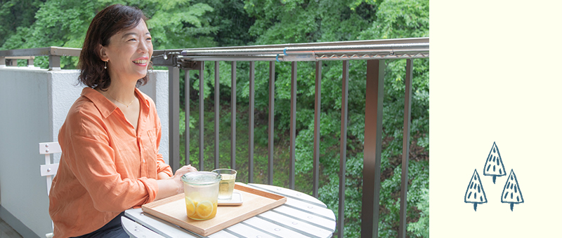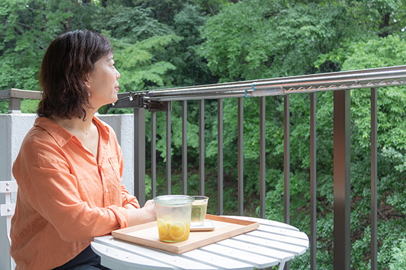 鈴木さんこの部屋を内覧したとき、玄関を開けた瞬間に一面緑の森が見えて、「うわっ、ここにする!」と即座に決めました。ここに住んでからは、家から出たくなくなりましたね。もう、お家大好き(笑)。春は山桜、秋は紅葉、四季折々の自然が楽しめますし、野鳥の声も聞こえてくる。テラスで双眼鏡でバードウォッチングをしたり、本当に飽きないですね。