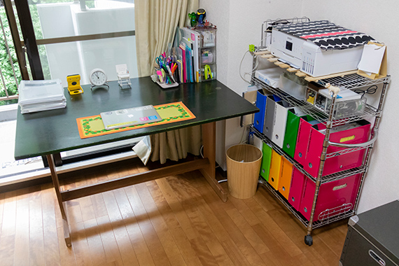 プリンタやファイルボックスを格納したラックをサイドに置いています。
