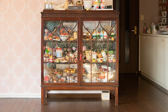 食品サンプルアート作品がどっさりと! おもちゃ箱のように楽しげな飾り棚。