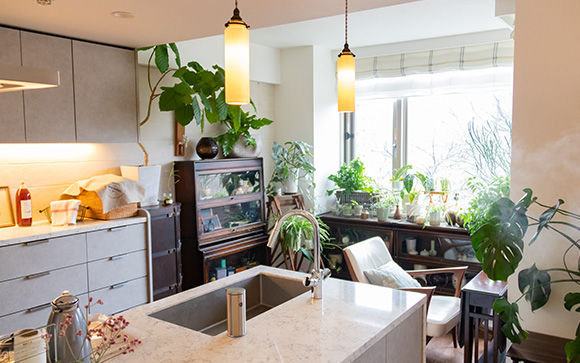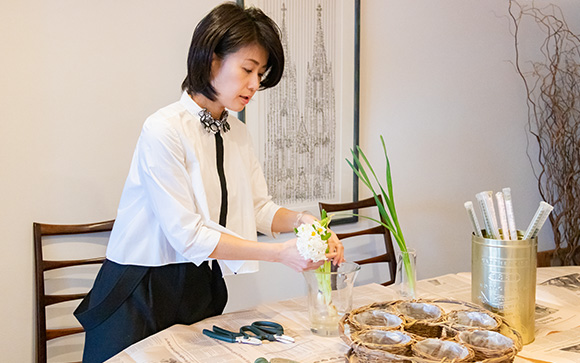 斉田さんは、フラワースタイリストとしてブライダル装花やイベントの装飾を手がけるほか、ご自宅で少人数向けのフラワーアレンジメントレッスンも行っています(※)。部屋にはあちらこちらに観葉植物や季節の花が飾られていて、まるで部屋全体がグリーンハウスのように温かみのある雰囲気です。