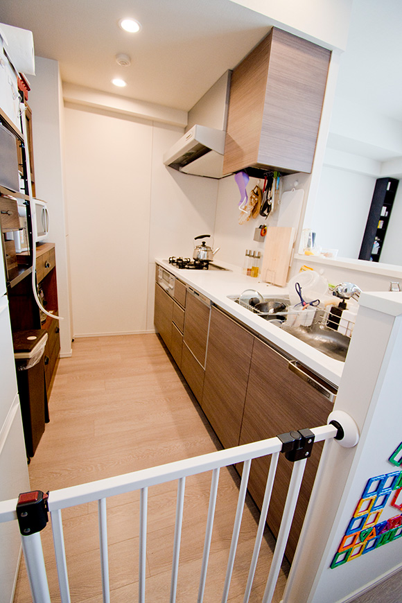 キッチンにベビーゲート、カウンター壁面で遊べるおもちゃ。