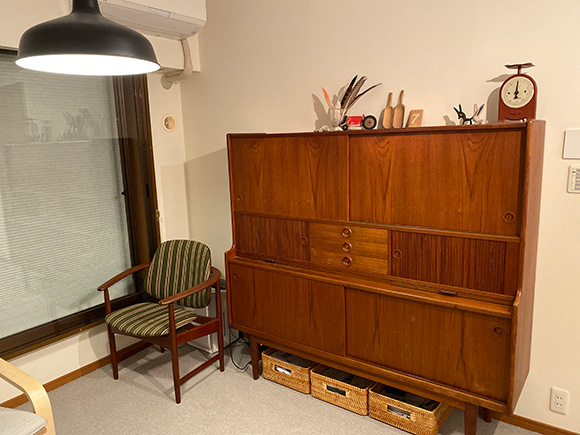 仕事部屋には、デンマークの1960年代のアンティークキャビネット。