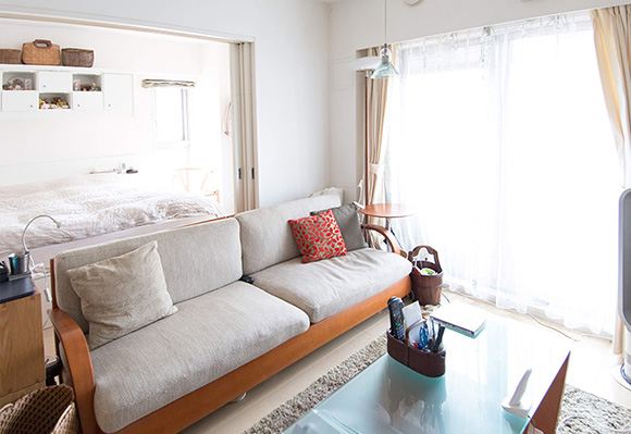 新浦安から持ってきた大きな家具は、アルフレックスのソファだけ。近くにトランクルームを借りて、当座使わない衣類や趣味のモノはすべてそこへ収めました。