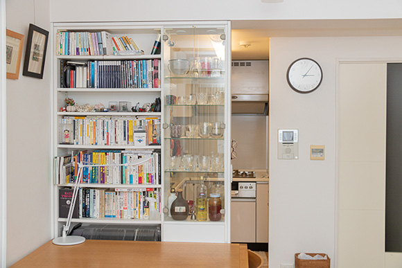 本、DVD、グラスコレクション、2人の好きなものや思い出の品が並ぶ飾り棚。