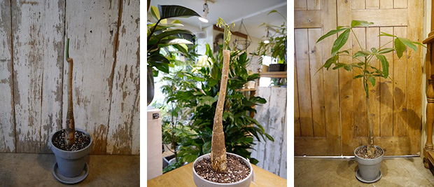 以前、寺井さんが切り戻したのちに再生したパキラ。