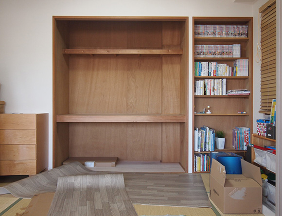 森山さんご依頼のお客様は、小学3年生と幼稚園の年長さん、2人のお子様がいるご家庭です。リビングに接した和室があり、当面は子ども部屋ではなく、和室にキッズデスクとプレイスペースを設けて、目の届く場所で勉強したり遊んだりしてほしいというご要望でした。そこで和室の押入れをDIYすることになりました。リビングにスペースを設ける広さがない場合は、このように収納スペースを改造するのもひとつの方法です。