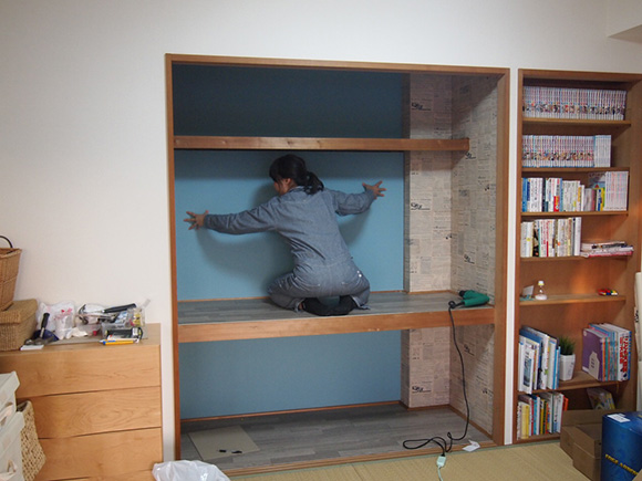 押入れ背面には水色の壁紙、横面には新聞紙柄の壁紙をチョイス。