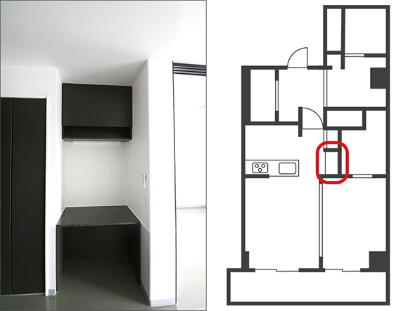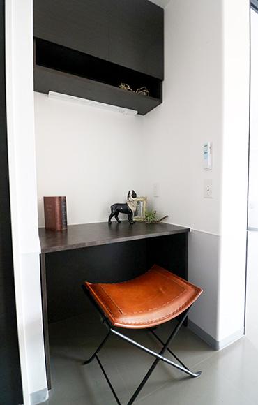 森山さんこちらも「ホームステージング」の事例のひとつなのですが、キッチン横に設けられていた物入れスペースを、簡易的なワークスペースとして利用する演出を行いました。キッチン横に面したスペースなのでふつうなら物入れか飾り棚として活用するのでしょうが、最近はリモートワークが浸透していて、家の中で独立したワークスペースが必要というお客様の声も多いので、ワークスペースとしてみました。