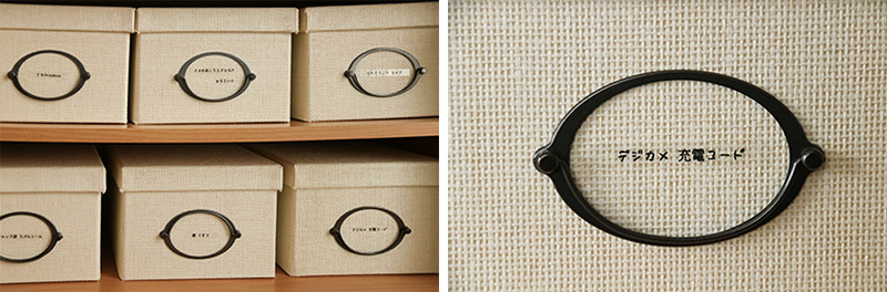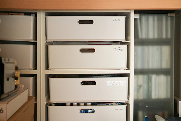 よく目にする場所なので、統一したボックスにラベリングして収納。