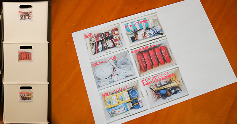 写真ラベルは、備蓄食の収納など雑多な物をひとまとめにした収納にも適しています。
