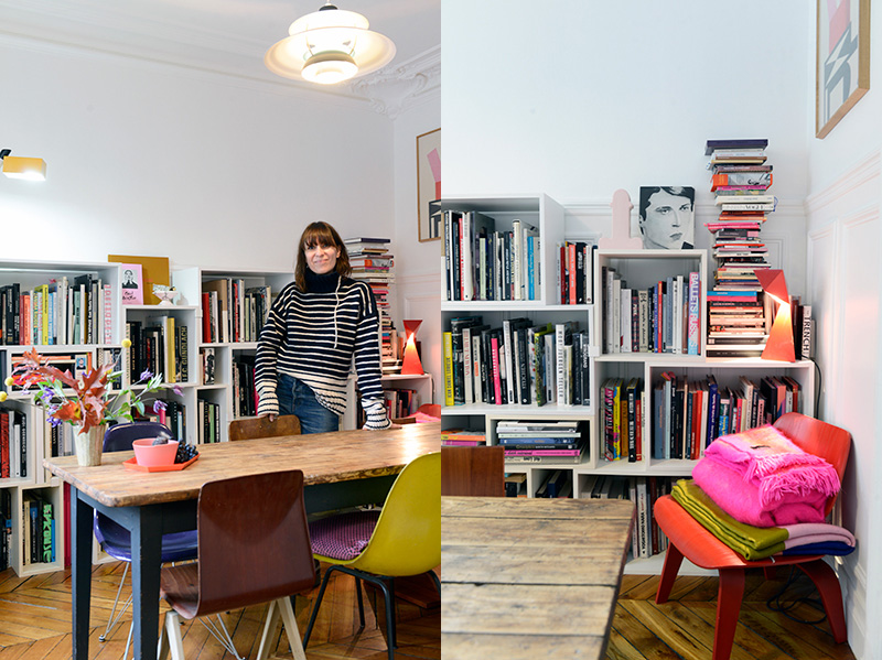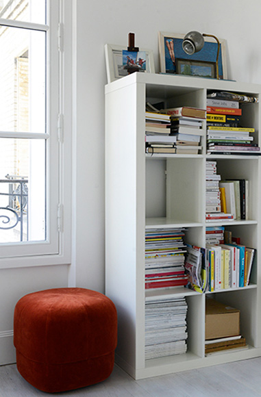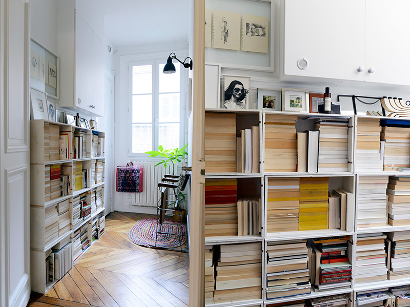 加藤さんパリ在住ファッションデザイナーのオレリー・フォレスティエさんにとって、本は「私の人生の一部」と言うほど大切な存在です。仕事場を兼ねたアパルトマンのダイニングの壁一面に置かれた本棚には、彼女の仕事の資料でもある画集や写真集が、アーティスト毎に分類して収められています。コーナーに置いたチェアとファブリック、またチェアと同色のスタンドのヴィヴィッドなカラーも、本棚の楽しいアクセントになっています。