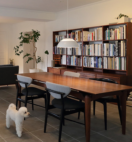 加藤さん「FILE(ファイル)」は、本棚も含めたフルオーダーの収納家具の実績も豊富なデザイン事務所です。自邸をそのショールームになさっている石川さん。ダイニングは家族やスタッフの食事の場であるばかりでなく、クライアントとの打合せの場でもあります。そのためヴィンテージの本棚には、打合せに使う本も収められていますが、家具の力も手伝い、本棚がダイニング空間にしっくりと馴染んでいます。暮らしと仕事が心地よく融合したお手本です。