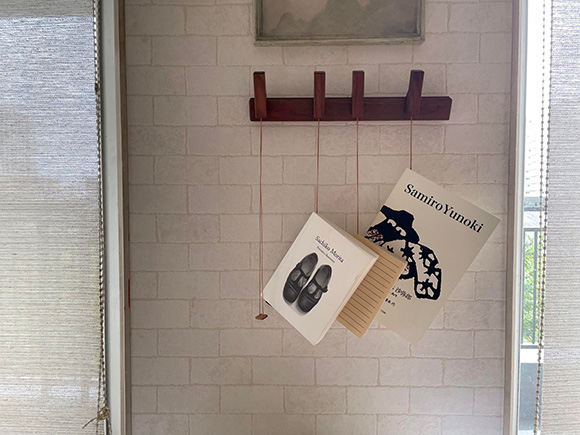 加藤さんまた、玄関の小さなスペースにある本棚は、本の背表紙を見せずに並べているのが面白い。「紙の色の違いを愛でる」という発想は、クリエイターならではの美意識ですね。小さな折り畳みの椅子が置いてありますが、小さくても心地よいこの場所でひとり読書することもあるそうです。