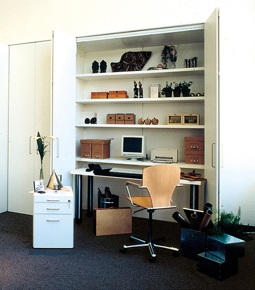 加藤さんお部屋のレイアウトにもよりますが、マンションの廊下、または居室内にある観音開きの収納スペースを、システム家具でリモデルして、本棚を備えたワークスペースをつくることもできます。扉をさっと閉めればすっきりとした壁面になります。
