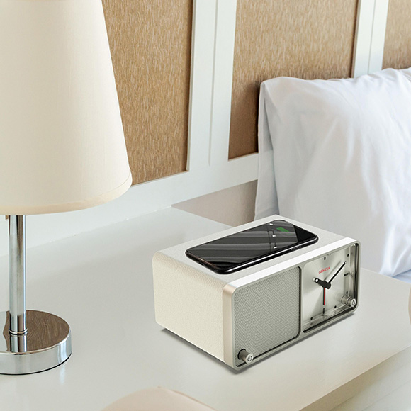 スマートフォンのワイヤレスチャージ機能を装備した多機能スピーカー。