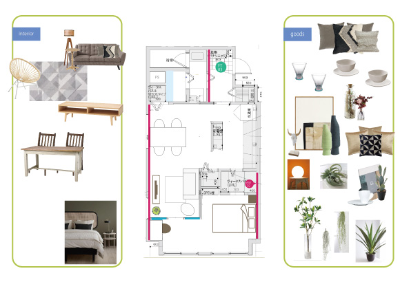 間取り図を見ながら、配置したい家具や小物をレイアウトします。サイズ確認も重要です。またお客様がイメージしやすいように、配置する家具や小物の写真を間取り図まわりにコラージュしたイメージボードで提案します。