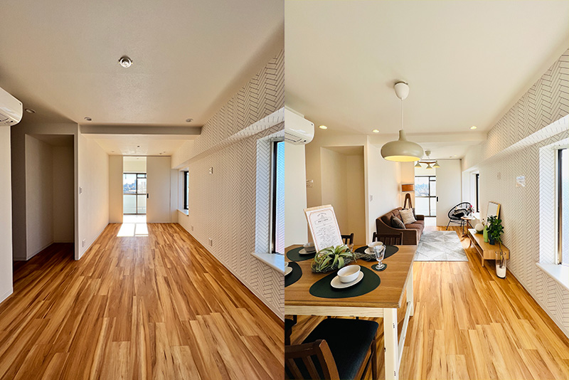 森山さんこれまでに500件以上の物件のホームステージングを手がけてきましたが、物件によってさまざまな間取りがあります。それぞれの部屋をいかに魅力的に見せるかという技術は、新築マンションを購入した方のインテリアづくりにも役立つかもしれません。どのようにホームステージングしたのか、事例と一緒にご紹介しますね。