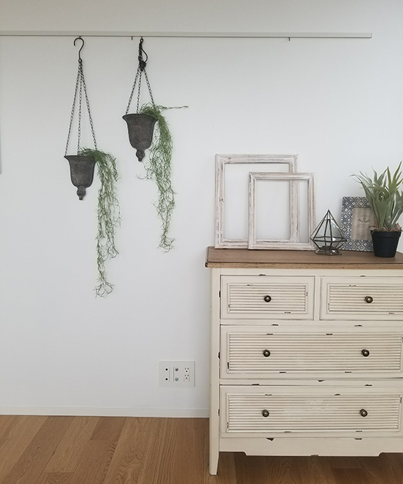 森山さん私のステージングでは、室内でも特にくつろぐ場所(単身用のお部屋ではベッド周り、ファミリータイプではリビングのソファやTV周りなど)にグリーンを置くことが多いです。最近の量販店で売っているフェイクグリーンは、かなりよくできていてバラエティも豊富。フェイクグリーンは土がいらないので、日当たりや置く場所を気にせず置けます。飾り方の自由度が高まる点でも大変おすすめです。「観葉植物はお世話が大変」「あまり日差しが入らない部屋にもグリーンが欲しい」という方にオススメです。