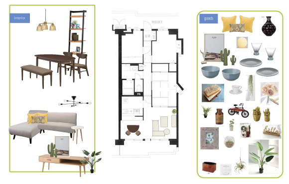 間取り図を見ながら、配置したい家具や小物をレイアウトします。サイズ確認も重要です。またお客様がイメージしやすいように、配置する家具や小物の写真を間取り図まわりにコラージュしたイメージボードで提案します。