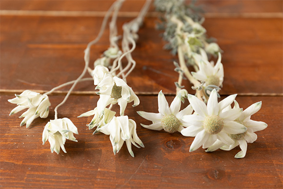 フランネルフラワーの生花(写真右)と乾燥させた状態(写真左)。