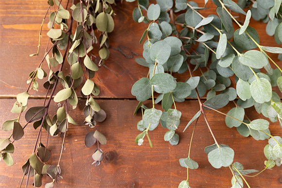 グニーユーカリの生花(写真右)と、乾燥させた状態(写真左)。