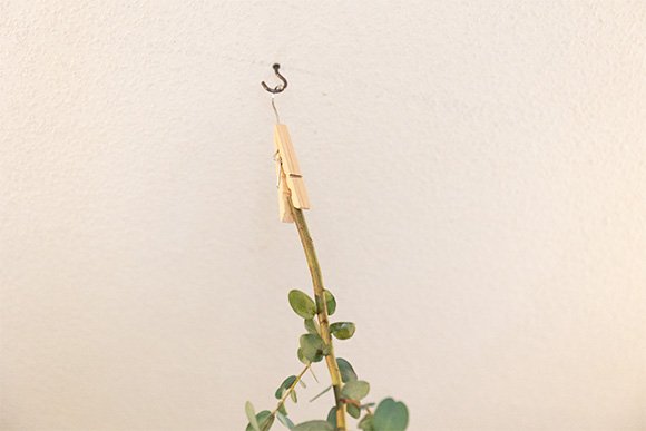 花の茎をハンギングしているのは、「S字フック付き木製ばさみ」。