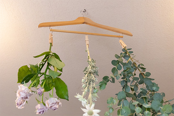 ハンギングした花や葉が自然に乾燥していく移ろうさまを眺めているだけでも、心豊かになります。植物との暮らしをお楽しみください。