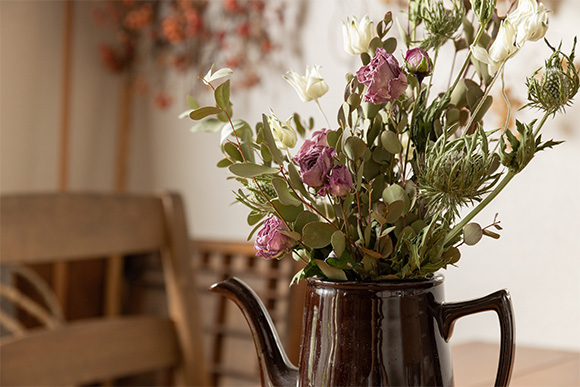 吉本さん出来上がったナチュラルドライフラワーは、ポットに飾ったり、スワッグやリースにして壁に飾ったり、自由にアレンジしてください。