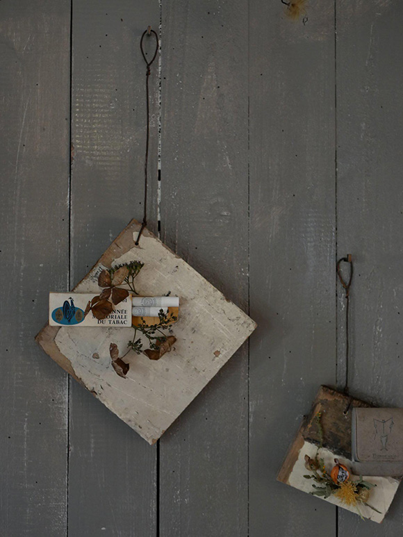 お気に入りの包装紙や絵とナチュラルドライフラワーを古材にアレンジしたオブジェ作品。
