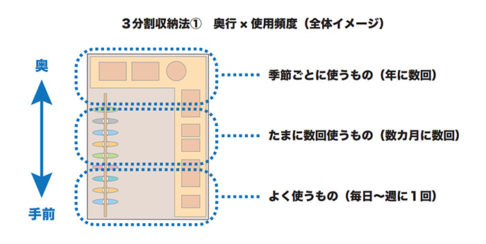 次にご紹介するのは、収納場所にある奥行と高さ、それぞれを使用頻度で分けて考える「3分割収納法」です。物を収める時にエリア分けをイメージしながら収めると、空間を生かすことができます。