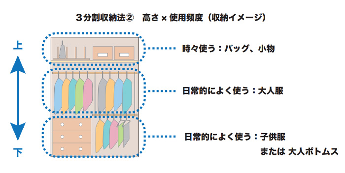 奥行・高さx使用頻度による「3分割収納法」をうまく活用して、より使い心地のよい収納を目指してください。