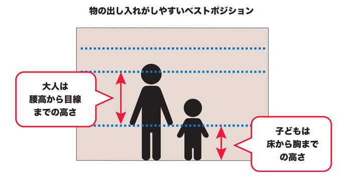 ベストポジションとは、図のように「大人の場合は、腰高~目線」、「子どもの場合は床から胸までの高さ」です。使用頻度が高く日常的によく使うものは、このポジションに定位置を決めるといいですね。