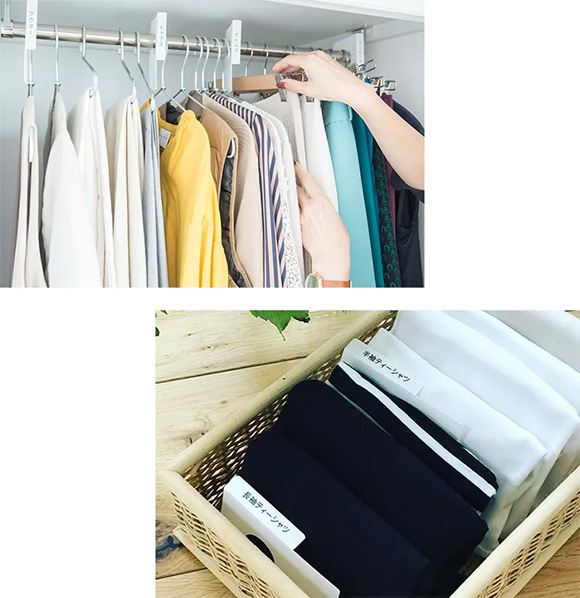 ハンガーパイプや引き出しの衣類をわかりやすく分類できます。