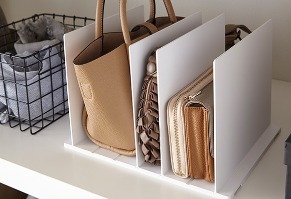 スマート2個組」(山崎実業)を使って、ベストポジションよりも上の高さ位にある棚に配置すると取り出しやすくなります。この商品は、バックの幅に合わせて調整できるため、バックを折ることもなく収納できておすすめです。