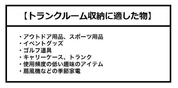 トランクルームも、奥まで歩くスペースを確保しつつ「3分割収納法」の考え方で、手前(頻度が高い物)/奥(頻度が低い物)、下段/中段/上段に、使う場面や使用頻度で分けて配置します。棚を用いて、物の上に物を直に置かないようにして(取り出しにくくなるため)、縦空間も有効に活用しましょう。