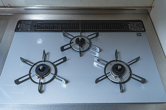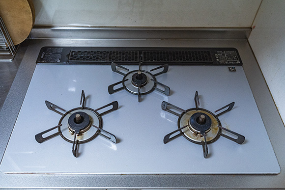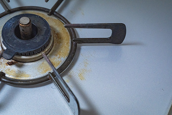 コンロ周りは、アルカリ洗剤をつけた焦げとりスポンジでこすって落とします。
