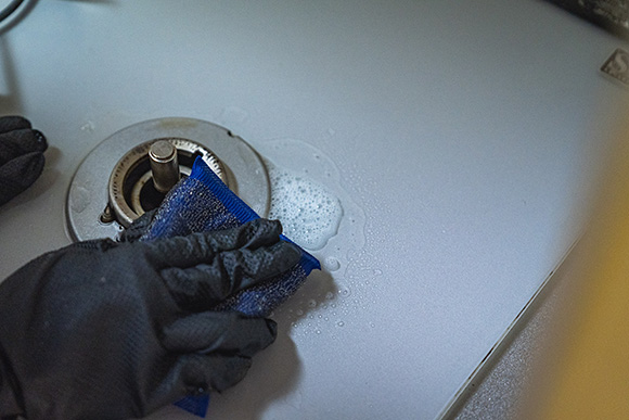 一般の方は、上の写真のように、漂白剤や油汚れ用洗剤など、強力に汚れ落としができる一般洗剤、スポンジや焦げとりブラシなどを用意してください。また、アルカリ洗剤は強いので、指先を守るためにもビニール手袋は必須です。他に、長年放置してしまって洗剤では取れなくなったひどい水垢取りには、耐水サンドペーパーを用います。これだけあれば、一般家庭の掃除は一通りできるはずです。