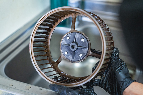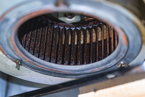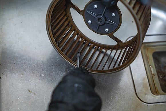 換気扇のフィルターを外した奥には、シロッコファンがあります。ここもギッシリ油汚れが!
