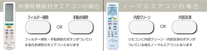 順さんお持ちのエアコンが「お掃除機能付きエアコン」かどうかわからなくなってしまった場合は、上の図のようにリモコンのボタンで見分けてください。