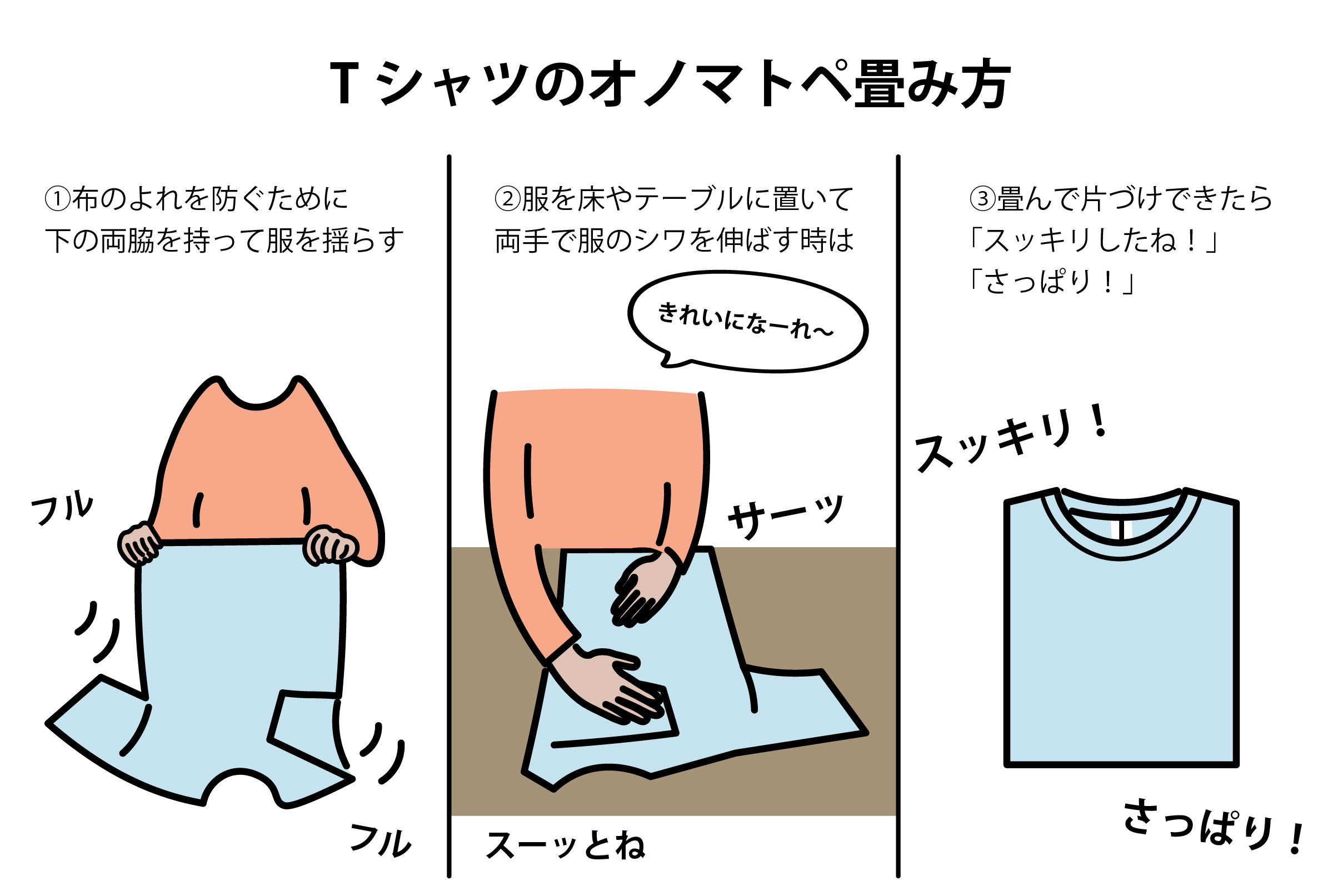 野中さんが小学校で実施している、子ども向け「Tシャツのオノマトペ畳み方」。
