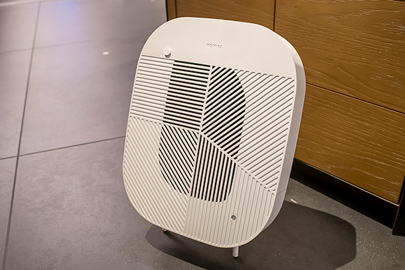 吉田さん「KOMMA(コンマ)」は、デンマークのデザインチームがデザインし、韓国で製造しているブランドです。空気清浄機Löv(ロブ)は、縦壁掛け型/縦スタンド型/横壁掛け型/横スタンド型の4種類の変型設置が可能です。わずか8㎝の薄さと3.5㎏の軽量なので、壁にかけたり飾り棚や部屋の隅に置いたりと自由な置き方ができます。