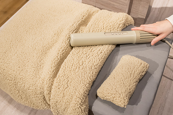 ワンタッチで、ダブルサイズまでのふとんをふっくらさらさらに仕上げます。ふとん乾燥機というと、収納されたホースをつないでまた戻してというイメージでしたが、スティック1本を挿し込むだけでしっかりふとんを乾燥してくれます。「ダニ対策」コースもあって、清潔に寝心地の良い快眠環境を整えてくれます。