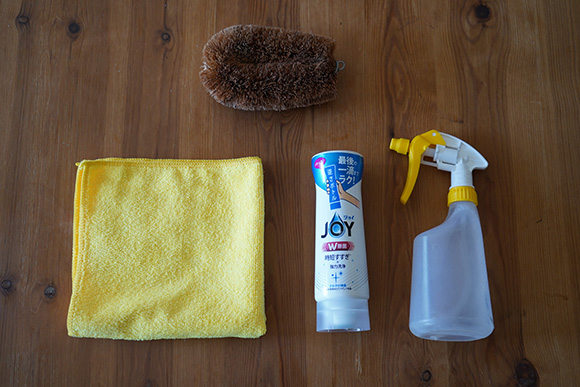 大きめのタワシ、タオル、食器用洗剤、ハンドスプレーのボトル