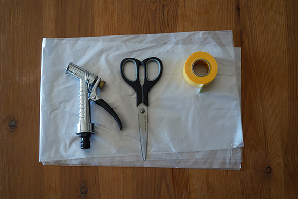 養生用に使うビニール(ごみ袋で代用)、建築塗装用マスキングテープ、