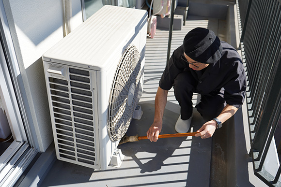 室外機の下にも、砂ぼこりや糸くずが溜まりがち。